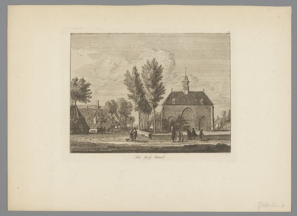 Jacques Philippe Le Bas created this print called 'Jeu de boules spelende figuren in een dorp', meaning people playing bowls in a village, using etching techniques. The composition of the print is divided into two horizontal halves. The lower half depicts a scene of village life, with figures playing bowls in the foreground. The linear perspective guides the viewer's eye from the foreground figures to the buildings and trees in the background, integrating activity and environment. This etching offers a carefully constructed view of 18th-century Flemish village life. The figures are arranged in a semi-circular pattern that provides balance and rhythm. The architecture, foliage, and cloudy sky enhance the viewer's sense of depth and realism. The interplay of light and shadow adds texture and complexity, demonstrating an understanding of form and space. This understanding emphasizes the social dynamics of the community.