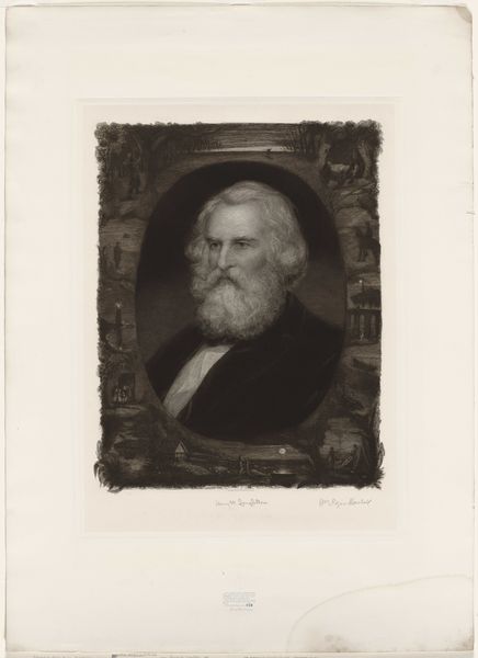 Curator: Before us is Auguste Danse’s 1894 portrait of Édouard Fétis, a study in etching, drypoint, and intaglio, currently residing here at the Rijksmuseum. Editor: Immediately, I see a kind of pensive stillness—a somber introspection hanging in the air, almost like a faded photograph capturing a bygone era. Curator: Precisely. Note the artist's masterful use of line. Each etched stroke serves to construct form and capture the light's subtle play across Fétis's visage. Semiotically, we read this as a discourse between the artist and sitter. Editor: Yes, the layering of lines gives a remarkable depth, but to me, it almost makes him seem a bit… trapped. There’s a palpable melancholy. The portrait has this incredible whisper of a past life, all captured in monochrome. What was Fétis thinking? Curator: Functionally, it communicates not just a likeness, but a certain gravity. A drypoint allows for burr, you see, resulting in that velvety richness, accentuating the profound quality of the portrait—which contrasts against areas left relatively untouched, offering us spatial depth. Editor: Ah, the burr creating that textural drama…almost palpable in its somber richness. You know, it reminds me of a poignant poem, each line adding another layer of understanding to a complex character. Is he sad? Wise? Both, perhaps? I feel an uncanny familiarity, like meeting an ancestor. Curator: Intriguing. Technically, drypoint lacks the precision of pure etching, thus embracing that air of immediacy… It contributes much to what you are saying; its textural surface quality alluding to what one might consider 'time'. Editor: In a way, Danse hasn't simply depicted Fétis but captured the quiet echoes of time itself. Thinking of mortality… This piece certainly made me reflect. Curator: Indeed, a formal study that transcends mere representation and evokes introspective contemplations, where material handling lends depth of interpretation beyond the biographical reading. A successful print if I may say. Editor: Absolutely, a silent dialogue with a long-gone face! Powerful.