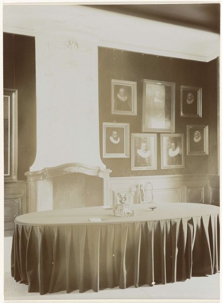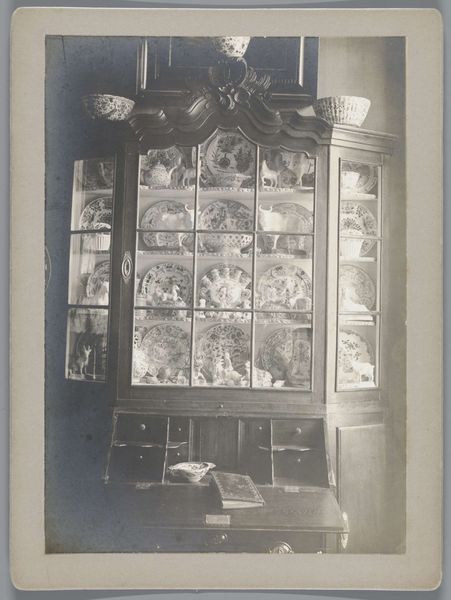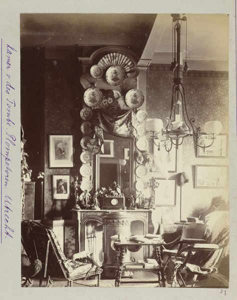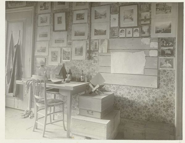 Editor: This is a photograph titled "Student Rooms of Pauw van Wieldrecht’s Friends in Utrecht and The Hague," taken in 1889. It feels intensely personal, almost claustrophobic with everything crammed into the frame. What symbols jump out at you? Curator: The density is key, isn’t it? It speaks to a deeply ingrained human need for self-representation through carefully curated objects. The plates, especially, surrounding what seem like group portraits, function almost like protective emblems. What stories might these ‘emblems’ whisper about these young men and their place in Dutch society at the time? Editor: That's interesting, I hadn't thought of them as protective. Do you mean in a heraldic way, linking them to family history or ideals? Curator: Partially, yes. Heraldry provided a structure of visual identity, but here, it’s been democratized and domesticated. These aren't family crests so much as chosen signifiers, badges of belonging. Notice the posters pinned to the door; what might they signify about shared identity? Editor: Ah, yes! Shared interests, maybe? Perhaps the announcement of a play or society event, something defining their intellectual circles? So the objects together build up an image of student life… Curator: Precisely! It's not just documentation; it is constructing and communicating identity through carefully arranged symbolic forms. Even the light fixture acts almost as an halo above their self-created world. How does seeing this world from over a century later affect you? Editor: I'm struck by how much we still do this - surrounding ourselves with objects that tell our story. Maybe the medium has changed, with digital spaces taking on some of this work, but the impulse feels very consistent. Curator: Yes, our digital profiles inherit this need to project through a curated visual vocabulary. This photograph, in its intimate chaos, becomes a reminder of how powerfully symbols shape our sense of self.