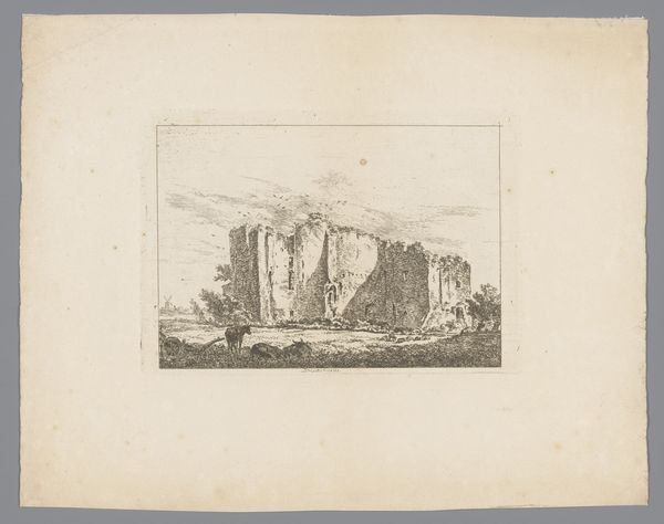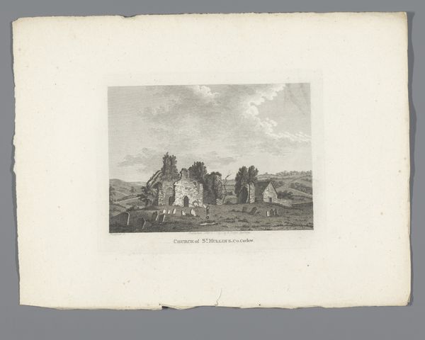 James Newton’s etching of Baltinglass Abbey presents us with a study in contrasts, captured through delicate lines and subtle shading. The composition is split into two distinct masses, with the abbey’s ruins on the right, and a more complete tower structure on the left, evoking a play between decay and endurance. Newton uses the etching technique to create a nuanced tonal range, from the bright sky to the darker foreground vegetation. Note how the sky, filled with light clouds, creates a sense of depth and openness, contrasting with the more confined spaces within the ruined structures. This use of light not only highlights the architectural details but also imbues the scene with a sense of transience. The strategic placement of the ruins prompts reflections on time, memory, and the shifting meanings of historical spaces. This artwork uses a formal structure to pose questions about how we relate to the past.
