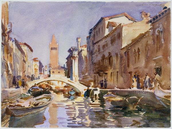 Curator: This is Denman Waldo Ross’s "Canal Scene, Venice," currently held at the Harvard Art Museums. It's a rather small piece, less than a foot in either dimension. Editor: The heavy brushstrokes! I’m immediately struck by the sheer materiality of the paint, thick and almost sculptural. Curator: Considering Venice's history as a mercantile power, it's easy to read the canal as a site of labor and trade, a space shaped by the circulation of goods and people. Editor: Absolutely. The way the artist renders the water—the visible layers of paint reflecting light—highlights the labor involved in creating this illusion of movement. Curator: The buildings themselves also speak to the economic and political structures that shaped Venice. The architecture is undeniably linked to power and privilege. Editor: And yet, Ross doesn’t idealize it. There’s a certain roughness, an honesty in the application of paint, that keeps it grounded. Curator: The painting complicates easy narratives of Venetian romance, doesn't it? Editor: It does. I appreciate how Ross foregrounds the physical act of painting. It's more than just a pretty picture. Curator: A fitting way to consider Venice, a city built on trade, labor, and the materiality of its own existence. Editor: Indeed, a city always under construction, and this painting captures a moment in that perpetual making.