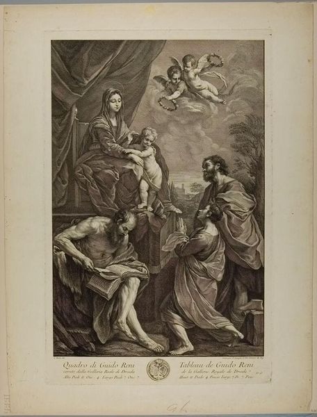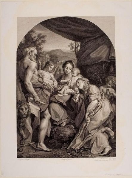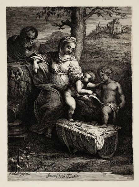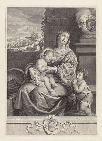 Curator: Mauro Gandolfi, born in 1764, created this engraving of Saint Mary; note the careful gradations in tone. It evokes a quiet, almost somber mood. Editor: Immediately, my eye goes to the two children—one being nursed by Mary, the other gesturing outwards. Consider the enduring symbolism of the Madonna and Child. Curator: The composition is cleverly structured, balancing the figures against the classical architecture and landscape. This creates a visual harmony even within the monochrome palette. Editor: The infant gesturing outwards is likely John the Baptist, prefiguring his later role. Such familiar iconographic elements offer cultural continuity. Curator: Indeed. And observe how the artist uses hatching and cross-hatching to modulate light, giving depth and form to the figures. The attention to line is remarkable. Editor: Looking at it anew, I’m struck by the tension between the familiar religious iconography and the artist's distinctive technical style. Curator: Yes, it provides a compelling synthesis, doesn't it? Editor: Absolutely. A fascinating blend of form and enduring symbol.