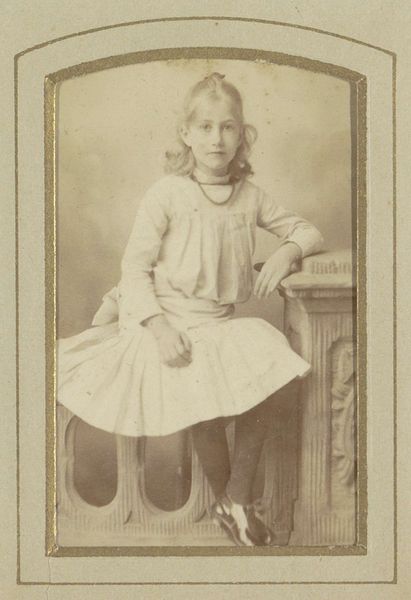 Editor: This is a captivating albumen print from the late 19th century, created by B.J. Pottjewijd, titled "Portret van een onbekend meisje, leunend tegen een stoel met een paraplu in de hand" - Portrait of an unknown girl, leaning against a chair holding an umbrella. There's something so poignant about this image of an unknown girl... what stands out to you when you look at it? Curator: The material conditions of the image's production are crucial. It's not simply a representation, but the result of specific labor processes – the photographer's, certainly, but also potentially those involved in preparing the photographic materials themselves. Consider the albumen print process, reliant on egg whites: it ties the image to a very specific network of material resources and economic relations. What kind of social stratification allowed the family of this girl access to this medium of self representation and remembrance? Editor: That’s fascinating, thinking about the egg whites as a key ingredient and indicator of resources available to this girl’s family. So, the materials used speak volumes. I'm also curious, in connecting labor and art, does that devalue the photographer's artistic vision? Curator: Not at all! Understanding the materiality actually enhances our appreciation. The photographer's choices – the lighting, the composition, even the choice of the umbrella and the chair – were all constrained and enabled by the available materials and technology. What meaning does the symbol of the umbrella possess in this image, in that social context? Editor: True. And how different this experience is, materially and socially, from snapping a quick phone photo today. The materiality really underlines that this was a special, deliberate, constructed moment. I had not really considered it like this before, thank you for sharing your thoughts. Curator: And thank you for pointing me towards the artistry imbued into a specific time and place, it goes beyond simple record-keeping.