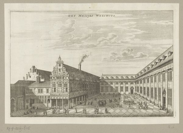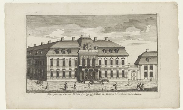 Evert Maaskamp's rendering of the Koninklijk Paleis in Amsterdam presents a study in perspective and proportion. The sepia tones and fine lines, achieved through meticulous engraving, construct a scene both grand and intimate. The building's facade, with its symmetrical array of windows, is rendered with precision, while the figures in the foreground are diminutive, emphasizing the palace's imposing scale. This contrast is not just a matter of representation but a deliberate play on power dynamics. The palace, a symbol of authority, dwarfs the individuals, suggesting a structural hierarchy. Maaskamp's technique, characterized by clean lines and calculated gradations of light, invites us to consider the role of architectural space in shaping social relations. This image, therefore, functions as more than just a depiction; it's a structured commentary on the relationship between power and the individual within the urban landscape.