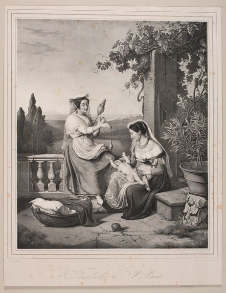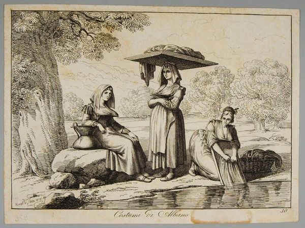 Editor: Here we have "Girl at the Well" by George Jakob Felsing, at the Harvard Art Museums. It depicts two women in what appear to be folk costumes seated by a well, and it feels like an illustration from a fairy tale. What do you make of this piece? Curator: Given the title, it's interesting how the well acts almost as a stage. These aren't 'girls' simply at a well; they're positioned for an audience. The surrounding arch and the very deliberate composition suggests a carefully constructed image, not a candid scene. Editor: So, you think this is less about representing reality and more about presenting an idealized version of rural life? Curator: Precisely. Notice how their costumes, while perhaps inspired by folk traditions, appear clean and decorative. This piece speaks more to the romanticized visions of the countryside that were popular amongst urban audiences. Editor: That's a great point; I see it now. Thanks! Curator: My pleasure. Considering the audience helps us better understand the artist's choices.