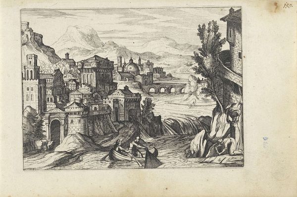 Curator: Hendrick van Cleve III's engraving, "The Emilian Fountain, Greece," presents a sweeping vista rendered with meticulous detail. The atmospheric perspective is compelling, don't you think? Editor: The lines create an almost melancholic mood. It’s as if the crumbling architecture is crying out. There is a clear contrast between the dominating clouds and the busy human figures in the landscape, one being chaotic, while the other is ordered. Curator: Van Cleve was active in the latter half of the 16th century. Viewing this piece through a postcolonial lens, we might ask whose "Greece" is represented here, and for whom? Editor: Structurally, the composition is divided into planes, with the fountain in the foreground establishing a clear focal point. The artist uses cross-hatching to achieve depth. Curator: Indeed, and the fountain, as a source of life and culture, perhaps symbolizes the layers of power and influence exerted over Greek lands during that era. Editor: It’s an interesting play of light and shadow, no doubt creating a somber tone, but the organization is what truly catches my eye. Curator: I appreciate you pointing that out; it reminds us that even landscapes can be potent carriers of historical narrative.