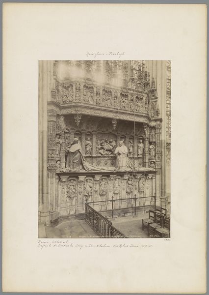 Editor: Here we have a photograph, taken between 1890 and 1920, depicting the south side of St. John's Cathedral in Den Bosch. The photographer is unknown. I'm immediately struck by the intense detail, the sharp angles, and how the scaffolding creates a strong horizontal contrast. What stands out to you when you look at this photograph? Curator: Primarily, the interplay of light and shadow, particularly how it accentuates the architectural structure and detailing. The repetition of vertical elements, those buttresses, creates a powerful rhythm, almost musical in its arrangement. Notice how the photographer uses the scaffolding as a structural element within the composition. It's not merely an obstruction; it contributes to the image's layered depth. Editor: I hadn't thought about the scaffolding that way. So, it's not just a record of construction, but a conscious compositional choice? Curator: Precisely. The photographer uses it to define space, create lines, and contrast the raw texture of the wood with the ornate stone. The photograph transcends being a simple documentation and transforms into an aesthetic exploration of form and texture. Ask yourself how the different sections relate in tone and value. Editor: That's fascinating. I guess I was initially too focused on the subject matter, the cathedral itself, to see the artistic choices. Seeing how you break down the image into structure and light gives me a whole new way to consider photography and, honestly, architecture as well. Curator: Considering those visual components encourages us to engage with an image's visual dynamics beyond surface level observations.