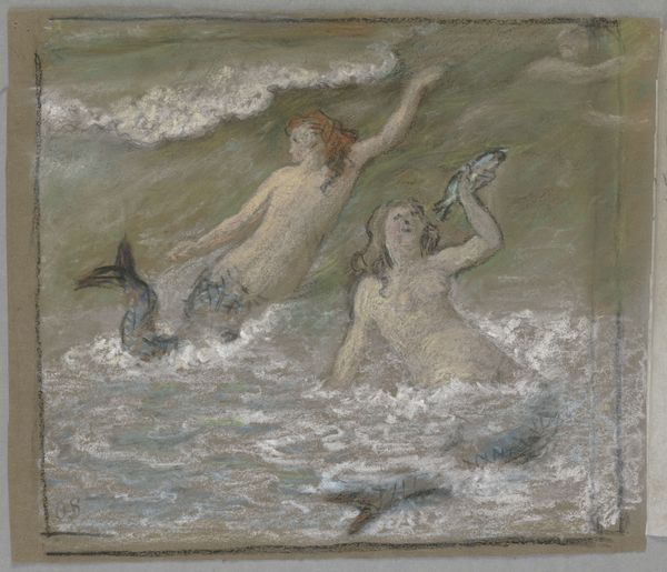 Curator: Here we have Hermann Hendrich’s "Mondnacht Am Meer," an oil painting whose title translates to “Moonlit Night by the Sea.” There isn’t a firm date for this work, but scholars generally place it within the Romanticism movement. Editor: It's immediately striking—a blend of cool blues and greys that creates such a hushed, ethereal atmosphere. It's both sensual and somehow unsettling. Curator: Sensual is a good word. The pale figures of the women immediately pull the viewer’s eye, and that very pale, soft light on the water adds to this otherworldly quality, almost like a classical myth. There are three nude figures in the foreground, almost nymphs, set against this imposing rock formation. Do you think that imposing structure impacts how the painting operates? Editor: Absolutely. It makes me think about the role of women and nature, doesn't it? These figures appear vulnerable against this monolithic, almost masculine landscape. Is the dark, towering rock meant to overshadow or protect them? It also touches upon historical concepts about the male gaze. Here, women's bodies are prominently displayed, in a moment of vulnerability on display for the presumed (male) viewer, which has problematic connotations. Curator: I agree it plays with vulnerability. Though, let’s remember Romanticism often uses nature—grand landscapes, like that craggy cliffside—to symbolize the sublime, a kind of awe and terror. The moonlit setting would absolutely amplify those feelings. Think about how lunar cycles have long been connected to the feminine and mysterious elements within nature. Editor: True, that reading reframes things—the women are not merely passive subjects, but participants in a deeper, perhaps occult, connection with the natural world. It complicates the image's power dynamics, hinting at a more empowered agency. And that little crab between the reclining figures… I almost missed it at first! What a bizarre detail! Curator: Right? The detail underscores a link to the natural elements, yes. Maybe this unexpected critter disrupts the perfection often sought in classical representations. Its presence feels grounded, real, a reminder of earthly matters. The crab also serves as an emblem for navigating emotional depth because the crab represents strong intuitive abilities and ways of guarding oneself from harm. Editor: Looking at the entire piece—the soft light, the vulnerable nudes, that strangely placed crab and a rugged coastline… This isn't just pretty. It hints at tensions and anxieties, an intersection between feminine vulnerability and untamed nature that keeps resonating with me. Curator: Well said, and thanks. It certainly leaves us plenty to consider regarding gender, symbolism, and the Romantic pursuit of intense feeling!