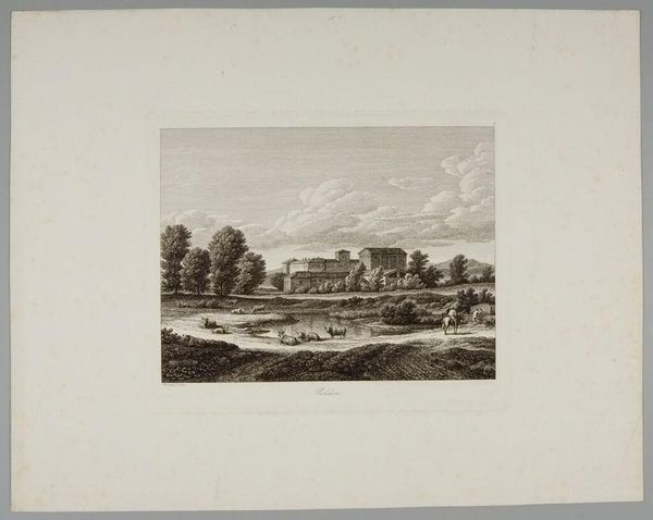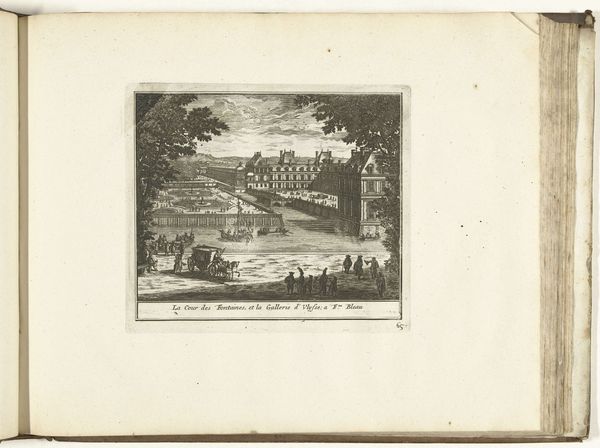 Curator: This is Adam Perelle’s "Landscape with Fountains, a Large Fountain by a Façade with Basins." Perelle, born in 1640, captured scenes like this in detailed engravings. Editor: It has an air of theatricality, doesn’t it? The carefully staged figures, the grand architecture...it’s as if we’re viewing a performance of power. Curator: Indeed. Fountains themselves were potent symbols of status, artistry and control over nature. The ruling class often used them to reflect their dominion. Editor: And the basins, tiered and overflowing...water, the source of life, elegantly displayed. This small plate speaks volumes about the values of the period. Curator: It does make you wonder about the perspectives of the people. What meaning did the fountain hold for them? Editor: Seeing it now, it becomes a reminder to view art as a historical reflection of socio-political views. Curator: And also how enduring these symbols are, how landscapes continue to be manipulated to convey meaning.
