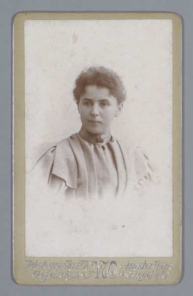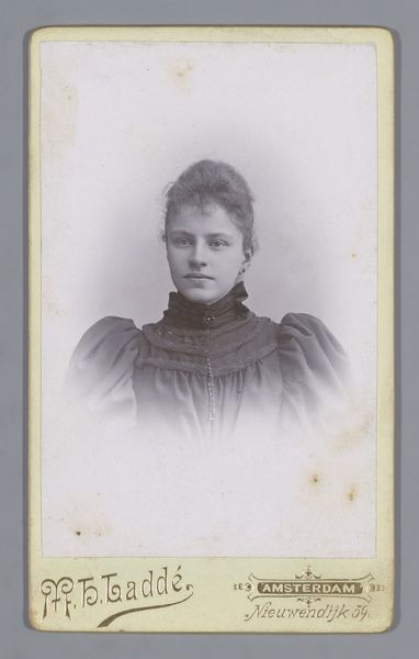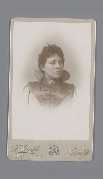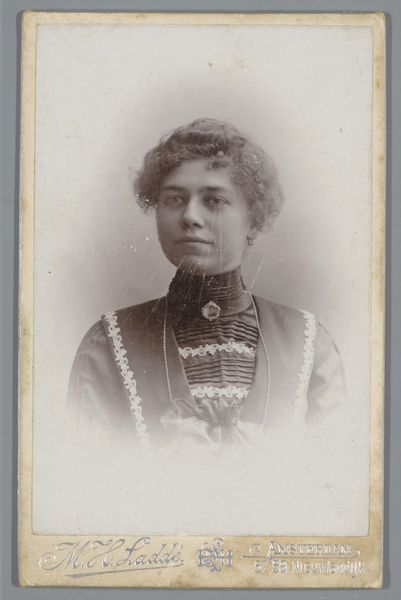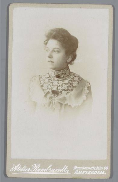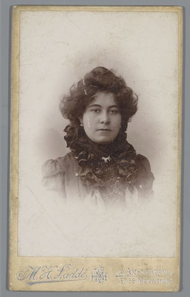 Curator: Standing before us is "Portrait of an Unknown Woman," a gelatin silver print with colored pencil additions created sometime between 1892 and 1906 by Machiel Hendricus Laddé. It is currently housed here at the Rijksmuseum. Editor: It has a certain ethereal quality. The sepia tones, the soft focus…she seems almost to float within the frame. Her gaze is steady, but something about the lack of distinct features softens the impact, gives it an element of timelessness. Curator: Yes, the artistry here plays with ideas of representation and identity at a crucial moment in Dutch history. This was a period when the public sphere was rapidly changing. Photography became more accessible, impacting how individuals crafted and presented themselves. How does the photograph as an object help define how women exercised their new societal roles? Editor: It's fascinating to consider the performativity inherent in early photography. The woman's clothing, a corseted, high-necked gown adorned with pearls, tells a story about aspiration and social standing. How often could such portrait opportunities arise for individuals? Who has access and what choices do they make for posterity? What narratives were they seeking to inscribe in their representation? Curator: Laddé's studio was a public-facing entity within the city's social structure, a hub for identity creation and display. I see a certain vulnerability in her presentation. The softening effect suggests an intimacy but perhaps one created specifically for wider consumption and societal acceptance? What power did the female sitter have in dictating these terms? Editor: That vulnerability is exactly what makes it so compelling! But also consider the subtle assertion in that steady gaze and pose. The soft colour pencil heightening might signal a subtle embellishment, adding to an ideal. She’s participating in crafting a narrative, but within a society of many limits. Curator: The portrait encapsulates larger societal forces regarding representation. Photography here reflects and reinforces codes, creating a powerful, though ambiguous dialogue, I think. Editor: Absolutely. It prompts us to ask: whose stories are told, how are they being told, and who holds the brush or the lens when recording those stories for our contemporary viewing. Curator: Indeed. An interesting perspective on Dutch identity and gender constructs. Editor: Agreed. This photograph provides an important glimpse of social performativity in the late 19th century.