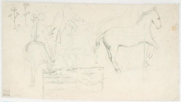 This is Pieter Dupont’s preliminary study for an etching, "Kar met drie paarden", made with graphite. The composition is dominated by the linear arrangement of three horses pulling a cart, the entire scene rendered with delicate lines that suggest form and movement. The artist's choice to present the horses and cart in profile emphasizes their sequential progression across the pictorial plane. This horizontal orientation draws the eye from left to right, creating a sense of continuous motion. The thinness of the graphite lines, combined with the unfinished nature of the sketch, imparts a sense of immediacy. The artwork operates within a semiotic framework where the horse-drawn cart symbolizes labor, transportation, and perhaps a slower, more traditional way of life. The unfinished quality of the sketch also challenges fixed meanings, inviting viewers to contemplate the themes of work and progress within a rapidly changing society. The sketch is a study in form and function, offering a glimpse into the artist's process of translating observation into art. It prompts us to reflect on the relationship between artistic intention and cultural interpretation.