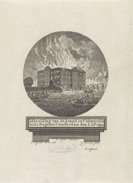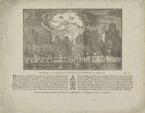 This print, titled "Afbeelding van den brand der Ouden Schouwburg, te Amsterdam", was created by Erven de Weduwe Jacobus van Egmont and depicts the fire at the Oude Schouwburg in Amsterdam. The piece offers a glimpse into the social and cultural life of 18th-century Amsterdam, and the role of theater within it. The print captures the moment when the fire, which broke out on May 11, 1772, engulfed the theater. It also shows people fleeing in panic. The text accompanying the image speaks to the chaos and confusion, noting how the crowd's desperation to escape actually blocked the doors, leading to more casualties. The fire not only destroyed the theater, a place of public gathering and entertainment, but also spread to nearby houses, causing even more devastation. This image serves as a stark reminder of the fragility of life and the power of collective panic, reflecting on the communal experience of disaster and loss in a bustling urban environment.