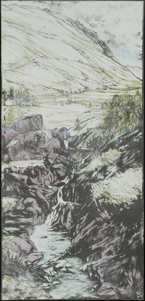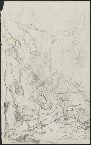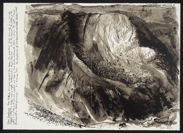 Editor: This striking print is by John Piper. It doesn't have a title or date, but it's part of the Tate collection. The monochromatic landscape feels almost biblical to me, a kind of rugged, promised land. What visual symbolism stands out to you? Curator: The stark contrasts are key. The light seems to emanate *from* the landscape, almost as if the rocks themselves hold a sacred history. Doesn't the composition remind you of pilgrimage routes in early Christian iconography? The dark crags and illuminated path invite the viewer on a spiritual journey. Editor: I hadn't thought of it that way, but I can definitely see the resemblance to a spiritual journey. It’s as if the landscape is alive with meaning. Curator: Precisely! The landscape becomes a vessel filled with cultural memory. Piper masterfully uses familiar visual cues to evoke a deep sense of place and history. Editor: Thank you for your insights. It really shifts my perspective.