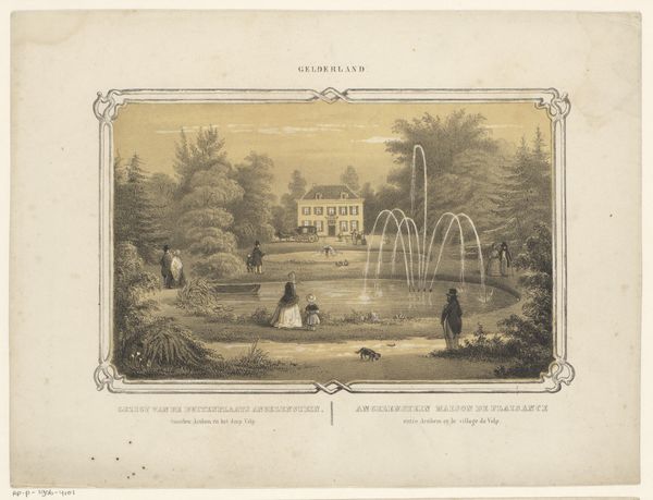 Editor: So, this is "Gezicht op de buitenplaats De Oorsprong in Oosterbeek" by Frederik Lodewijk Huygens, made sometime between 1812 and 1887. It's an engraving. It’s such a peaceful scene, almost dreamlike. All the figures seem content in their own little worlds. How do you interpret this work? Curator: It evokes a yearning for simpler times, doesn't it? Consider the estate itself: meticulously positioned at the high point to command the landscape, its architecture echoing power. Now, notice the water; what does the mirrored reflection of the estate suggest to you? Editor: That the present grandeur also looks back to the past? Curator: Precisely. Water, throughout art history, often symbolizes memory and reflection – both literal and metaphorical. And consider the leisurely activities. Fishing, promenading – they're all visual shorthands for cultivated leisure, but also for the idealization of nature, an escape from the burgeoning industrial world. Editor: So it’s not just a pretty picture, but a carefully constructed symbol? Curator: Indeed. These images reinforce social hierarchies and aspirations. The 'Oorsprong' becomes a locus of cultural memory, its symbolism far outweighing its simple depiction. Can you imagine how this image could impact a viewer in the 19th century versus now? Editor: Wow, I never would have considered all those layers of meaning just looking at it casually. I’ll definitely think twice about landscape prints from now on! Curator: Absolutely, that interweaving of image, symbol and meaning truly enriches our experience and informs cultural legacy.