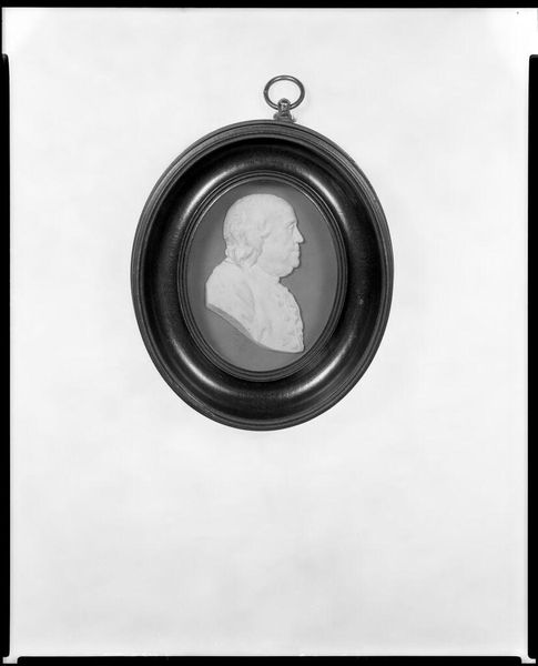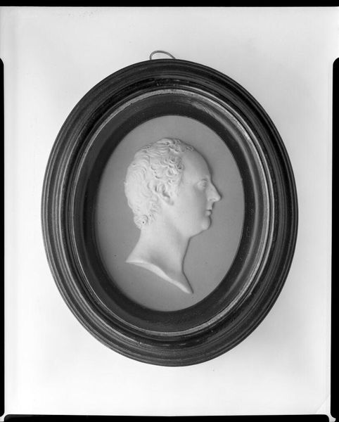 Curator: Let’s turn our attention to this delicately rendered portrait: "Felix Baciocchi, Prince of Lucca and Piombino," crafted by Giovanni Antonio Santarelli sometime between 1804 and 1814. Editor: Intimate, isn't it? Like a cameo glimpsed from a love letter. The stark white profile against that void… it’s quietly dramatic. The craftsmanship is wonderful. Curator: Indeed. Santarelli worked during a period captivated by Neoclassicism. This style looked back to ancient Greece and Rome for inspiration. Notice the profile view. The simple elegance echoes classical portraiture. Editor: It's almost severe in its simplicity. But look at the details. The way the light catches the curl of his hair. He’s both powerful and… well, a little vulnerable, no? A complex figure contained in this small frame. I imagine it being something to be treasured. Curator: He certainly was. Baciocchi became Prince of Lucca through his marriage to Elisa Bonaparte, Napoleon’s sister. Editor: Ah, the Napoleon connection! That explains the imperial vibe I was getting. So this wasn't just decorative. It’s a potent statement. Propaganda even? To elevate this man. And that explains why he might not look very happy too. Burden of command and all that. Curator: That’s astute. These miniature portraits often functioned as symbols of status and power. Think of them as the Instagram of their time, used to disseminate controlled likenesses. Editor: Instagram, but requiring actual talent and not just a good filter! It makes me think, what story did the artist want to tell? Or was forced to tell? I’m suddenly even more drawn in now, knowing that power sits behind that delicate surface. Curator: Context adds such a rich layer, doesn't it? Santarelli's artistry meets historical imperative, crafting a statement about Baciocchi's place in the Napoleonic era. Editor: Right, like a quiet explosion contained in that little circle. Art always holds more than what immediately meets the eye. Curator: An excellent point, leaving us to ponder the layered meanings within this seemingly simple profile.
