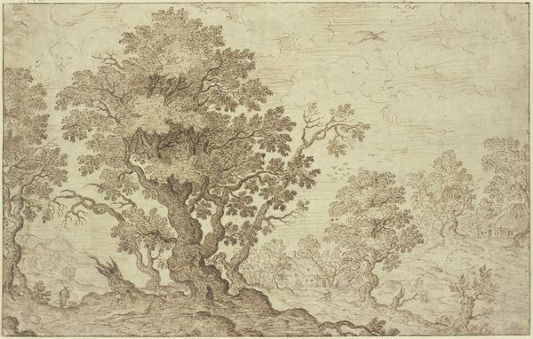 Curator: This is Alexander Cozens' "Trees under a Cliff," currently held in the Tate Collections. The support measures 229 by 304 millimeters. It looks like ink on paper. Editor: Oh, it's got such a wonderfully brooding, almost melancholic feel, doesn't it? The lines seem to huddle together, creating this enclosed, secretive little world. Curator: Cozens was very interested in the picturesque, and that informed his artistic production. His technique involved something he called "blot drawing," a method of creating landscapes from abstract ink blots. Editor: Amazing! It's like he's letting the subconscious landscape just bubble up. You see the cliff looming, but the trees feel almost claustrophobic. It's both inviting and a little unsettling. Curator: I think it speaks to how landscape wasn’t just about pretty views; it was tied to ideas about national identity and property. The materiality of the drawing itself embodies these themes. Editor: Absolutely! The texture of the ink on the paper—you can almost smell the damp earth and feel the rough bark. It pulls you right into the scene. It’s like a secret garden, filled with shadows and whispers. Curator: Indeed. It's a powerful reminder of how art can distill complex ideas into simple forms. Editor: A tiny drawing, a universe of emotion. I love it!