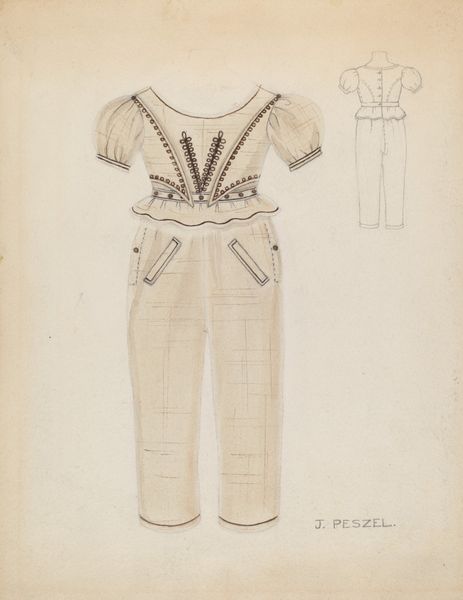 Editor: This is "Boy's Suit," a pencil and drawing on paper, created around 1936. There's a melancholic feeling I get from this piece; a sort of longing perhaps, for an idealized version of childhood, judging from the subject and precise style. What do you see in this work, looking at it from your perspective? Curator: What strikes me most is the date – circa 1936. The United States was deep in the Great Depression. The garment depicted isn't simply a suit; it represents aspirational aesthetics and a social commentary, specifically around class and economic disparities, wouldn't you agree? Editor: I hadn't considered it like that. The puff sleeves and elaborate details do seem to go against the realities of the time. Are you suggesting it reflects a disconnect? Curator: Perhaps, or maybe a longing. The drawing embodies the desires of some during times of widespread scarcity. Consider also how gender roles were reinforced through clothing; did this 'boy's suit' project certain expectations, a performance of masculinity, even at a young age? It's not just about the aesthetics but also about the underlying power dynamics and socio-economic conditions. Editor: That's fascinating. So even something seemingly simple like a child's garment design can be read as a reflection of complex societal forces? I wonder about who designed it and why... Curator: Exactly! By engaging with such seemingly 'simple' sketches, we unveil a dense layering of social meaning. Thinking about art from this perspective gives us invaluable historical insights. Editor: This has totally changed my view of the piece. I’m going to spend more time thinking about art within its social and political context from now on.