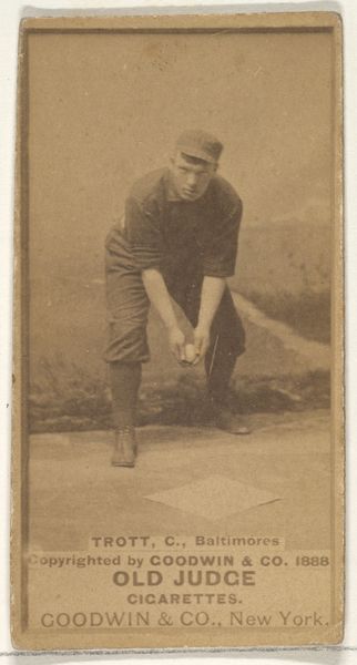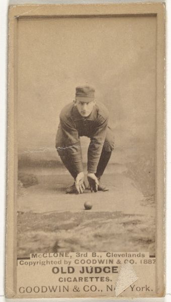 Curator: I'm immediately struck by the sepia tones; it's quite a muted image overall, invoking a sense of antiquity and simpler times. Editor: Exactly! This is “Frank Norris Graves, Catcher, Minneapolis,” a print from the "Old Judge" series, copyrighted in 1888 by Goodwin & Company. It depicts a baseball player, and what is truly remarkable, is its original function: an advertisement printed onto cigarette cards. Curator: Cigarette cards, yes. These small portable images circulated widely. It speaks volumes about the social values ascribed to sport at the time, using an athlete’s image to endorse a very different kind of product. And Graves, rendered here with that full beard… he's a symbol of virility, wouldn’t you say? An aspirational figure tied to the act of consumption. Editor: Absolutely. Look at the process: photo-to-print, a relatively nascent technology mass-producing images linked to addictive consumption, normalizing both the sport and the tobacco industry through each other. Also note the relatively poor image quality – it tells of mass production rather than careful curation. Curator: That ties into its symbolism even further. Think of baseball itself: It's about precision and physical prowess. To associate these qualities with cigarettes subtly suggests health benefits while clearly distracting the consumer from the negative effects. Editor: I wonder what materials were readily accessible, allowing for the distribution scale of such a promotional item, how the cardstock, ink pigments and paper influenced the print aesthetic? The mass-produced feel speaks directly to labour conditions and consumption at this moment in American history. Curator: And, on an immediate level, the image must have served as a powerful mnemonic device. Cigarette cards, like these, kept a sports figure like Graves circulating within a fan's memory… fueling the need to consume. He becomes a mythic character via repetitive exposure on something disposable. Editor: Precisely, we need to always examine the means through which such figures came to exist, looking not only at its immediate reception and consumption but the network of systems necessary for its proliferation! Curator: I'll admit, that's made me see the card in a more complex light. What started as a fairly simple sepia portrait now seems like a nexus of intersecting social and industrial narratives. Editor: And perhaps by tracing those networks and labour conditions, we gain better insights to current and future material practices and their societal influence!