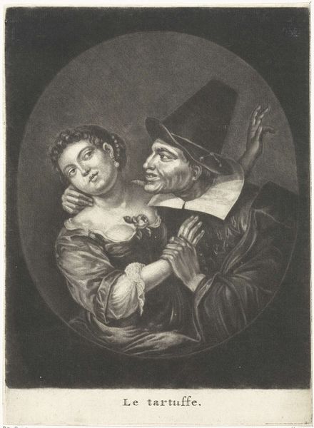 Editor: This is Lucas Cranach the Elder’s "Old Man and Young Woman," painted around 1540. The contrast in age is so stark, and the old man’s sly expression gives the painting an unsettling mood. How would you interpret this work from an art expert’s perspective? Curator: Precisely that stark contrast is key. Note how Cranach uses differing textures and tones to accentuate it. The old man's face, rendered with a gritty realism, is placed next to the young woman, whose complexion is almost porcelain-like. Consider the interplay of dark and light: the darkness surrounding the subjects throws the highlighted flesh tones and intricate detailing of their garments into high relief. What effect does the dress pattern achieve here? Editor: The dress's design draws my eye to the woman's face, with the way all those puffy embellishments encircle her. And the ring is really brought into focus because the artist isolated those hands from the subjects’ figures. It almost feels claustrophobic due to how compact and busy the arrangement of subjects in the foreground is. Is this cramped layout important? Curator: Most assuredly. Space functions as an element that contributes significantly to the psychological dynamic between the two figures. The way the artist minimized the background adds to the overall intensity. This deliberate choice by Cranach amplifies the thematic tension between the two figures. How else could the symbolism affect your perspective on this painting? Editor: I see what you mean! By thinking about just the lines and shapes, it reveals even more about the emotions behind the image. Thanks for explaining it. Curator: My pleasure. It’s through such formal analysis that the true depth and complexity of a work like this can be appreciated.