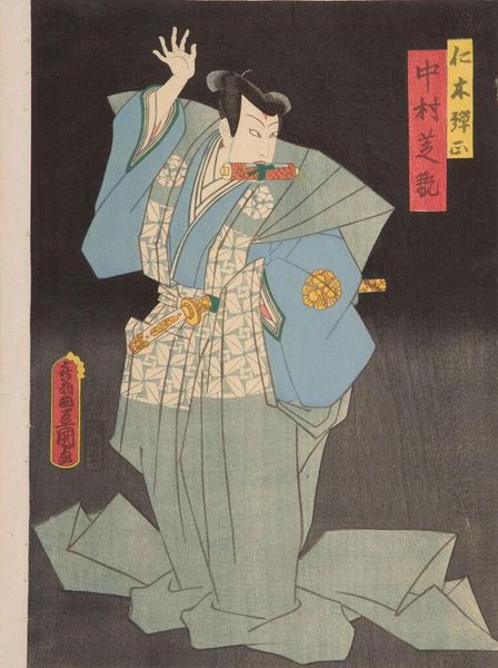 Editor: This is Tsukioka Yoshitoshi's print of Ichikawa Danjuro IX as Musashibo Benkei, a figure from the play "The Subscription List." I'm struck by the vibrant floral patterns and the controlled tension in Benkei's hand holding the scroll. What symbols do you see embedded in this image? Curator: Benkei's scroll represents knowledge and authority, but it's more than that. Consider the actor's determined expression, the way his robe is patterned: he embodies courage. The flowers are not merely decorative; they speak to the ephemerality of life. Yoshitoshi reminds us that even heroes face mortality. Editor: That's insightful. So the flowers are a memento mori? Curator: Precisely. And Benkei's strength isn't just physical. It's about navigating a world with grace, aware of life's fleeting nature. Editor: This really deepens my appreciation for the symbolism within this work. Curator: Indeed; symbols echo through time, shaping our cultural memory.
