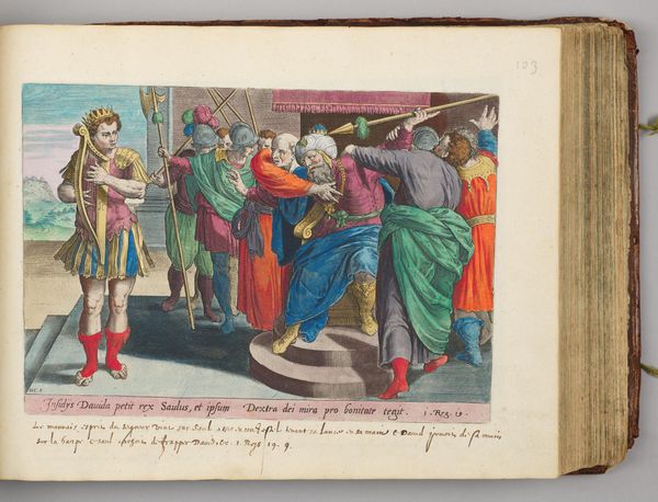 Curator: This is a print of Joseph Receives His Brothers and Benjamin, by Hans Collaert the Elder. It’s currently located at the Harvard Art Museums. Editor: It feels quite theatrical. The stage-like composition, the gesturing figures—there's a real sense of drama. Curator: The gestures are key. Collaert uses them to convey complex emotional states, the brother's supplication contrasting with Joseph's ambiguous expression, hinting at both forgiveness and perhaps, lingering resentment. Editor: I’m curious about how this imagery functioned within its historical context. What political or social messages were audiences reading into such scenes of reconciliation and power dynamics? Curator: It reflects broader themes of forgiveness, power, and reconciliation, resonating with various cultural and political contexts throughout history. The visual language is steeped in symbolic weight. Editor: Absolutely, and examining these symbols across time reveals how deeply embedded certain narratives are within our collective consciousness. Curator: Indeed, a potent reminder of how images shape our understanding of history and ourselves.