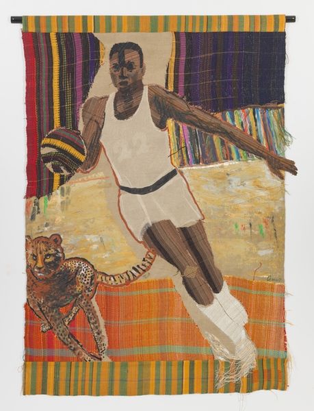 Curator: First impression? The figure just radiates…confidence. But against such a flamboyant background. It's arresting. Editor: Agreed. This is Kehinde Wiley's "Mame Ngagne Study II", painted between 2010 and 2012. Wiley, of course, is celebrated for placing contemporary Black figures in settings traditionally reserved for European aristocracy, painted using oil on canvas. It provokes immediate questions about representation and power. Curator: Absolutely, and what I love is how he disrupts those historical visual languages. I mean, he’s taken the grand scale of history painting, and then throws in this riot of color and pattern – those almost cartoonish mums – to totally re-contextualize everything. Does that pole or staff perhaps represent how the colonial-era aristocracy held positions of power? Editor: Precisely! The choice of the young man’s pose, and indeed his clothing, combined with the floral backdrop all work together in order to contest and subvert historical notions of race, gender, and power. The young man, clad in contemporary sportswear, confronts the viewer's gaze head-on. His casualness becomes an assertion. What does that assert for you? Curator: He asserts pride, and self-possession in this space, that to me feels deeply radical, especially when you consider who traditionally got to occupy these canvases. He holds that staff almost as a shield of protection. It speaks of resilience. Also, notice that it blends right into the chrysanthemum patterns in the background. That makes me think. Perhaps the individual holding on to his community roots in an ever changing social, racial, and political landscape. Editor: Yes, his individual identity merging into a complex community fabric, creating new narratives from the threads of the old, and maybe creating new spaces. Wiley seems to constantly explore, redefine, and perhaps reclaim the black male body through the lens of art history. Curator: Well said. It really does leave you pondering on art, identity, and who gets to be seen. Editor: A truly thought-provoking piece for the contemporary canon.