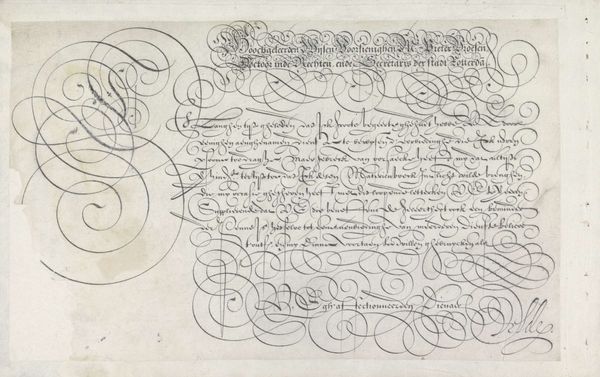 Curator: Here we have a striking example of Renaissance calligraphy. Dating from 1603, this engraving on paper, created with ink, bears the title "Kalligrafie: 'Lenicus mijn bemind soone …'". Editor: Immediately, the delicate flourishes capture my attention, evoking a sense of disciplined elegance and perhaps even a hidden message amidst its intricate form. Curator: The script itself offers a fascinating glimpse into social dynamics. Documents like this were carefully made. As such, calligraphy was a skill connected to the creation of societal roles in administration, justice, commerce, and education. Who could write determined in some way their place within the structures of the city, for example. Editor: Absolutely, and I wonder about access to literacy and script styles at this time. Who got to learn calligraphy? The composition reminds me of the way personal identity in our moment relies on the written word for validation. Think about the emphasis we put on journaling for self-discovery or letter writing as emotional regulation. Who was this message for, and why write it this way? Curator: Indeed. Calligraphy served not just a functional purpose, but was a highly respected art form with clear ties to identity. Its aesthetic was valued within society. In the Dutch Golden Age, one's handwriting might be a statement of education and class. Editor: What do we know about calligraphy and gender roles, though? Considering that we often associate highly stylized fonts with the decorative, it’s important to inquire about whether these scribal conventions enforced expectations around gender at this time. Curator: It’s a crucial point. Looking through this lens, it seems the very act of penmanship might reflect both individual expression and broader cultural norms regarding acceptable forms of display. Editor: This close look at "Kalligrafie: 'Lenicus mijn bemind soone …'" challenges us to reconsider calligraphy’s purpose and role as not just functional or beautiful but powerful too. Curator: A perfect synthesis between history, art, and critical social reflection.