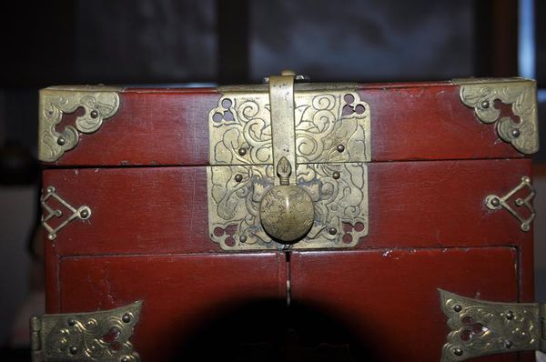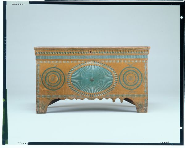 Curator: The piece before us is identified as an Odd Fellows ceremonial ark, created in 1856. Crafted through mixed media, carving, and wood, this artifact resides here at the Minneapolis Institute of Art. Editor: Right, the first thing that strikes me is how playfully serious it is. A box, but also this incredibly elaborate decorative statement, folk Baroque at its finest. Does this box have Baroque origins? Curator: Indeed! The ornamental flourish—the interplay between the gold accents and the red background, specifically—signals clear engagement with Baroque stylistic choices. Look closely at how these shapes—swirling foliage and crossed tools or maybe weapons—are articulated. There is geometry everywhere to be appreciated. Editor: I'm noticing the little peg feet, how charming. It makes me wonder what secrets or sacred objects were held within. Did it see regular use or mostly parades? Curator: It is not necessarily known; documentation is limited, given that the author or craftsman remains anonymous. But one can safely extrapolate from this object that Odd Fellows rituals were enhanced through aesthetic means and methods. Semiotically, one gleans some narrative thread that involves social practices and sacred symbolism. Editor: I think the fading paint gives it a beautifully haunted feeling; a feeling of old magic, or community bonds. What an object to just stumble upon. Curator: This intersection between design, form, and cultural symbolism truly establishes its merit in American folk art. Editor: The patina, I suspect, might contribute more significance now than the fresh paint did in 1856. It suggests a lifespan and continuous use by an anonymous party. I almost feel I know a great deal, but actually know nothing definitive. Thank you! Curator: Yes, the aesthetic and social narrative intersect, adding another layer of interpretation.