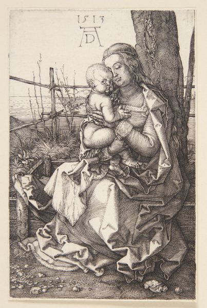 This is Albrecht Durer’s “Madonna by the Tree,” a captivating work rendered in the intricate medium of engraving. The stark contrast between the black ink and the white paper creates a visual experience that is both powerful and delicate, evoking a sense of reverence. Dürer masterfully employs line to define form, texture, and shadow. Notice the sheer density of lines, particularly in the Madonna’s draped clothing, the bark of the tree, and the detail of the flora, to create a sense of depth and volume. The intricate cross-hatching not only suggests form but also evokes a rich, tactile quality. The composition itself is carefully structured, with the Madonna and Child centrally placed, anchored by the robust tree. This arrangement lends a sense of stability and calm. Here the detailed rendering invites contemplation on themes of divinity and nature, and the relationship between the sacred and the earthly realms. The visual elements function together to create a space for contemplation and wonder.