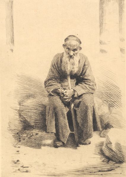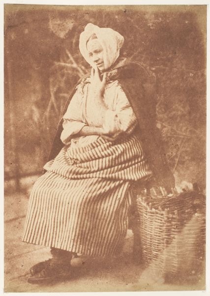 This photograph, "Newhaven Fishwife," was made between 1843 and 1848 by Hill and Adamson using the calotype process. The image, printed on paper, has a warm, sepia tone and a slightly soft focus, which results from the early photographic technique. The materiality of the calotype—its chemistry and its dependence on light—adds to the photo’s impact. It emphasizes the subject's humanity through the image's texture and tone. We see a working woman, possibly pausing from her labor to be photographed. This act acknowledges the labor involved in capturing the image itself. The choice of this process over more established art forms, such as painting, suggests an interest in capturing the real, unvarnished lives of working people. It also points to the social context of Victorian Britain, where new technologies were beginning to document all aspects of society.