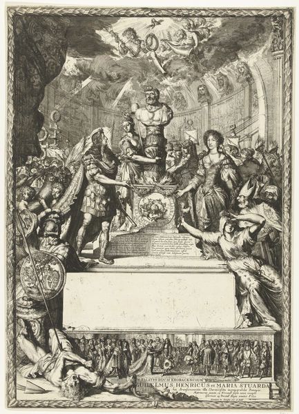 Curator: This intricate engraving is titled "Petrus, Johannes en Paulus door andere heiligen omgeven" - "Peter, John and Paul Surrounded by Other Saints". It was created sometime between 1571 and 1632 by Antoni van Leest. Editor: It strikes me as quite formal, almost ritualistic. The linear style gives it a real sense of gravity. And it's fascinating how densely packed with figures it is! Curator: Exactly. The work resonates with the artistic conventions of medieval and early Renaissance history painting. Notice the thematic focus on religious figuration, and consider how the engraving participates in a broader narrative of religious and social power. Who gets depicted, and how, matters enormously. Editor: Absolutely, and I'm immediately drawn to the craftsmanship. Think about the labor involved in meticulously etching those lines! It brings up questions of value, doesn’t it? The cost of materials, the artisan's skill, the function as a piece of devotional art… it’s all interwoven. Curator: Consider how the placement of the Holy Spirit at the apex symbolically reinforces divine authority over the scene below, which reinforces the power structures in the depicted scene and the role of religion within a deeply stratified society. Editor: And observe that almost austere presentation. There is this deliberate starkness to the use of line, almost drawing our attention to the materiality of the printmaking itself and, dare I say, democratizing the image. These prints were designed for wider dissemination than perhaps panel paintings or tapestries. Curator: Indeed! By exploring the visual representation of holy figures and biblical narratives, we can learn about shifts in ideology and the ongoing contestations over authority within a specific time. Editor: Precisely. It reveals how art functions not just as a visual spectacle, but as a tangible, reproducible object embedded within networks of commerce and belief. Studying process unlocks a broader material understanding. Curator: Looking at the legacy and historical setting really allows us to see the ways this piece creates complex conversations on cultural and societal identity that it embodies. Editor: Right, shifting our perception beyond a singular moment. For me it's a prompt to examine the means and conditions behind its production and consumption.