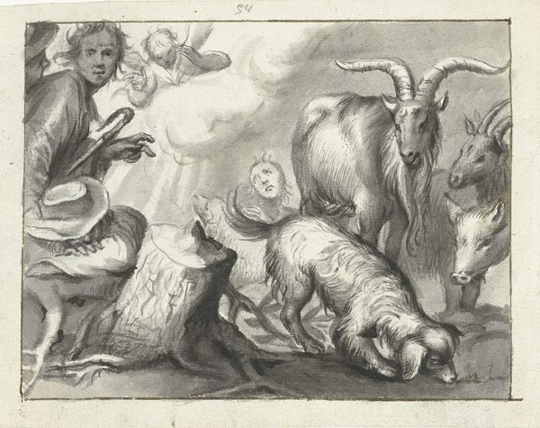 This is an engraving titled "Herder en herderin als liefdespaar met geiten" (Shepherd and Shepherdess as a Loving Couple with Goats), made by an anonymous artist. The composition is constructed of soft lines with gentle hatching, creating an idyllic scene of pastoral romance and harmony. The figures of the shepherd and shepherdess are grouped closely together in the left of the frame, almost merging to create a central form, whilst the animals take up the visual weight on the right of the frame. The artist masterfully employs the technique of chiaroscuro, using light and shadow to create depth and volume, to emphasize the textures of the animal fur and the folds in the clothing. The thematic tension between the human and animal realm subtly questions the traditional hierarchies. The gazes of the animals confront the viewer, challenging any sense of human dominance. The artist thus invites us to re-evaluate our understanding of natural versus the man-made. The artwork prompts contemplation on our place within nature and the complex systems that govern our perception.