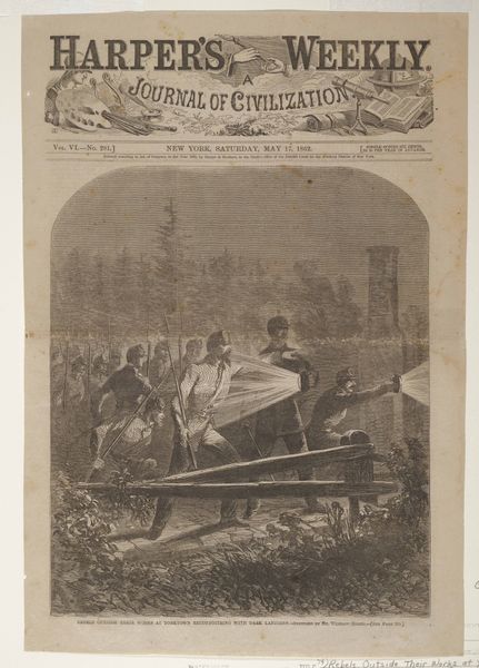 Editor: Here we have Winslow Homer's wood engraving, "Christmas Boxes in Camp—Christmas," created in 1862. It’s striking how the detailed cross-hatching creates a bustling scene within the army encampment, despite the limited tonal range. What do you notice about the composition and forms within this image? Curator: The rigorous linearity immediately arrests the eye. Note the artist's emphasis on geometric shapes. The tents establish a strong background of receding triangles, against which the figures form dense, nearly pyramidal masses. The engraving exemplifies meticulous construction—the controlled application of line creates not only form, but also the pervasive atmosphere. How do you interpret the stark contrast between light and shadow? Editor: I see it highlighting the harshness of the camp against the joyous occasion of Christmas. Curator: Precisely. Notice the artist does not provide comfortable gradients, but relies instead on the interplay between these stark visual components. The foreground elements are deliberately darker, effectively pushing the viewer back, perhaps emphasizing the solemnity or introspection often linked to the winter season. Where do you see compositional echoes? Editor: Now that you point it out, I notice that the wreaths, and then the curves of some hats or the mouths form similar circular echoes… Is that meant to evoke the cyclical nature of life, even amidst conflict? Curator: The repetition establishes a rhythm; it draws the eye through the complex composition. Through its stark forms, Homer creates tension. This is a carefully constructed tableau, its apparent spontaneity achieved through a deliberate formalism. Editor: I hadn't considered it so intentionally structured. Thanks to the visual language of the piece, it’s now easier to understand how the mood and emotional weight are conveyed through formal elements. Curator: Indeed. Through its strategic manipulation of line, shape, and form, Homer prompts us to ponder what it means to attempt normalcy, joy, even celebration, during wartime.