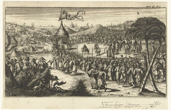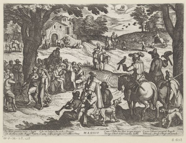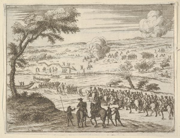 This etching, dating from 1688, captures the Prince's entry into Salisbury through a meticulously detailed composition. The eye is immediately drawn to the densely packed figures in the foreground and the sprawling landscape with the city skyline. The artist uses linear precision to define forms and textures which constructs a scene rich in semiotic potential. We see a man in a tree, a crowd in the center, and soldiers in the background, each acting as signs. Together, they may suggest the layers of society involved in this historical moment. The stark contrast between foreground and background creates a visual hierarchy, emphasizing the approach as a spectacle. This use of perspective flattens the narrative space, bringing the background closer and challenging our traditional understanding of depth. The etching transforms an event into a symbolic discourse, using its formal elements to engage with ideas of power, reception, and historical record.
