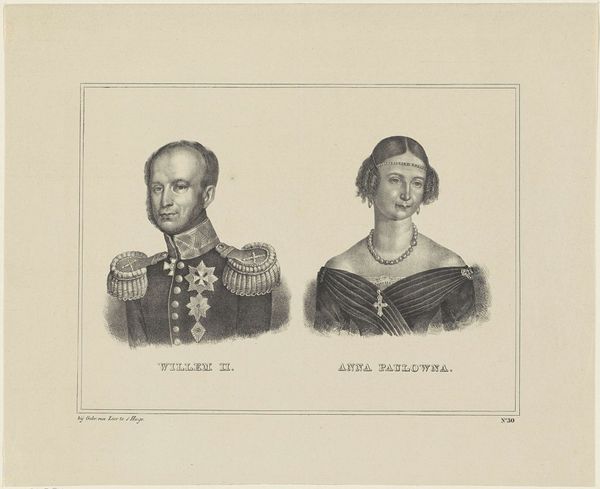 Curator: Welcome to the Rijksmuseum. We’re standing before a double portrait created sometime between 1839 and 1845. The work, done in graphite, depicts Willem III, King of the Netherlands, and Sophie van Württemberg. It is, notably, by an anonymous hand. Editor: My immediate impression is one of…cool formality. They’re presented with such careful detachment. Almost like chess pieces positioned on a board, emblematic of roles rather than expressions of individual lives, constrained by societal expectations of the era. Curator: That cool detachment certainly mirrors the Neoclassical aesthetic then ascendant, emphasizing reason and order. But also note how the graphite, though a humble material, renders meticulous detail – the braiding on Willem’s military attire, the delicate ruffles of Sophie’s gown. These visual components, so integral to projecting power, all reinforce social roles and expectation, precisely. Editor: And the choice to render them so starkly, side-by-side, makes me wonder about the dynamics between the couple. Their narratives as individuals, but also their assigned function in perpetuating a monarchy. Curator: There is a kind of weight conferred by such rendering; a weight, if you will, of history. The almost architectural austerity suggests permanence. Their likeness rendered through meticulous, repeatable gestures; pattern upon pattern; visual order suggesting social order, even destiny. It’s as much about solidifying a certain kind of cultural memory. Editor: A memory built on carefully constructed performances. Think of Sophie, confined by expectations of dynastic duty, and gender. There's this implicit power struggle embodied in the picture. Curator: Absolutely, and yet despite the rigid formality, the artist captures subtle humanity. Look at the slight softening around Sophie's eyes, Willem’s brow furrowed in concentration— fleeting indicators of feeling that, for me, offset what may at first seem simply staid or prescribed. They echo. Editor: Perhaps. What truly haunts is precisely what remains unseen: those struggles within rigid social constraints, anxieties and limitations behind those portraits. They whisper across the ages. Curator: Yes, they certainly compel a deep historical gaze. Editor: They certainly provide an important access point, nonetheless.