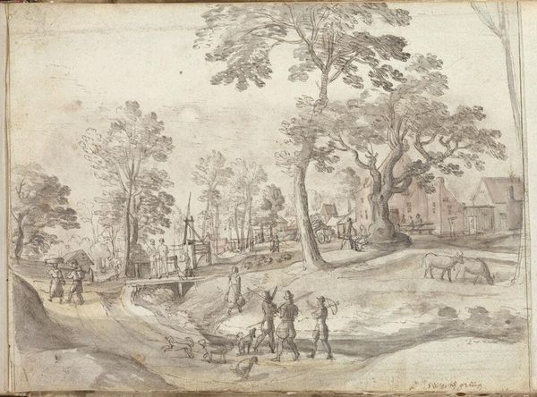 Editor: This drawing, "The Canal of Elsene," by a follower of Hans Bol, offers a glimpse into 16th-century life. The delicate lines create a scene of tranquil, everyday activity. What enduring symbols do you find within this landscape? Curator: The canal itself. Water is a potent symbol, representing purification and the flow of life. The figures crossing evoke transition. Note the sheep – traditionally symbols of innocence, guidance, and community. How do these elements coalesce for you? Editor: I see a narrative about community and movement, a quiet observation of daily life. It's almost like a memory captured in ink. Curator: Indeed. This seemingly simple scene holds layers of cultural memory. It invites us to reflect on our own journeys and the symbols that shape our understanding of the world.
