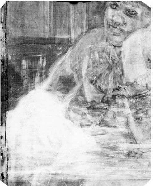 Editor: Here we have an X-radiograph of "Holy Family" by Jacopo Palma Giovane. The grayscale image gives a ghostly peek beneath the surface. What can an X-ray tell us about the painting's story and its journey through time? Curator: An X-radiograph reveals the material history. It shows us not just the artist's hand, but also the conservation efforts, the repairs, the underpainting. How do these layers impact our understanding of the work's cultural value? Editor: So, it's not just about the original intent, but the ongoing dialogue between the artwork and its caretakers? Curator: Precisely. The image becomes a palimpsest, reflecting changing tastes and institutional practices. It challenges the notion of a single, fixed meaning. Editor: I see. It makes me think about the museum's role in shaping our view of art history. Curator: Exactly! And how technology like X-radiography influences that role. This was very insightful. Editor: Yes, it's fascinating to consider how much history is embedded beneath the surface.