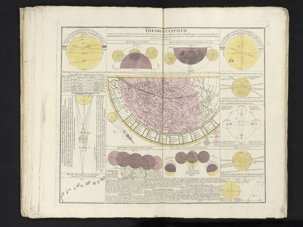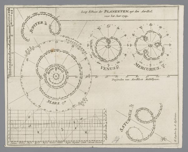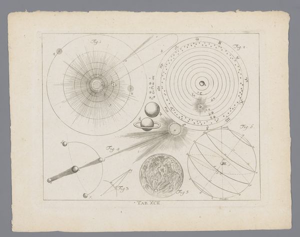 This “Map of the Planets’ Orbits for the Year 1730” is an engraving printed on paper. At first glance, what stands out is the systematic arrangement of celestial bodies. The composition is divided into precise geometric patterns and curves. Each planet is shown in its orbit around the sun. The lines of projection give the image a sense of mathematical rigor. But this is not just a cold, objective rendering. The meticulous detail speaks to the engraver's dedication to portraying the cosmos, and we can see how each planet’s designated orbit becomes a signifier of the order and predictability that underpinned Enlightenment science. The systematic arrangement of planets also reveals a deeper philosophical engagement with the structure of the universe. The visual language suggests a world governed by fixed laws and observable phenomena. It's worth noting that our understanding of the universe is always mediated by our tools of representation. This map is more than just a scientific document; it’s a cultural artifact.