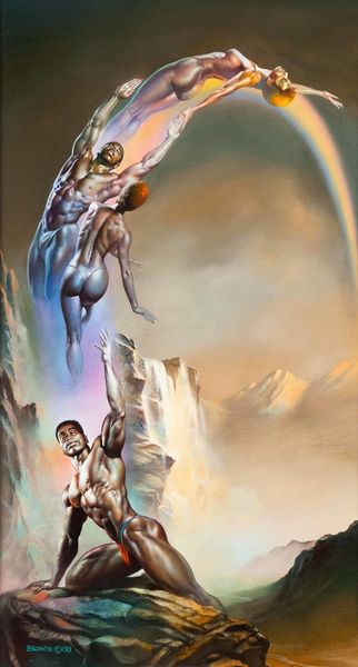 Editor: So here we have "Sagittarius" by Boris Vallejo, an oil painting from 1988. It feels, well, overwhelmingly masculine, with those intensely muscular figures. The figures—a centaur couple, it appears—seem caught in a moment of action, but…towards what? What do you see in this piece? Curator: Power. Raw, unleashed power. Vallejo isn't just painting figures; he's conjuring gods, or rather, the space where mythology collides with our most primal desires. And isn't that the most delicious sort of chaos? Look at the tension in the male figure’s bow, balanced by the feminine figure's steady aim. Does the dramatic lighting evoke anything to you? Editor: Yes, the high contrast in lighting creates this otherworldly or surreal mood, giving these creatures the kind of dramatic presence I imagine one only gets to see in dreams. Does the neo-expressionist style further emphasize emotion and distortion to convey the essence of these beings? Curator: Precisely. It is an exaggeration. Look closer - observe the tension in the archers contrasted with their animalistic, grounded stance. But beyond the purely aesthetic—the lighting, the muscularity, the almost cartoonish rendering—Vallejo offers a commentary, a playful questioning. Does this style feel at all timeless? Editor: It’s funny because at first glance, I thought of ancient myths, but there's definitely something very 80s fantasy-novel-cover about it, too. It’s that kind of heightened reality that feels both dated and eternally appealing. I'm not sure I had really thought about how much context changes everything! Curator: And isn't that the enduring magic of art? We bring our own narratives, our own baggage, and suddenly a centaur becomes a mirror reflecting ourselves. And that, perhaps, is the most erotic notion of all, wouldn't you agree? Editor: Yes, absolutely, there's more to explore than what I expected initially! Thanks for offering a lens into understanding the dynamism and depth of this fantasy art.