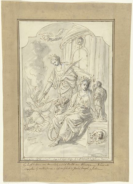 Louis Fabritius Dubourg created this drawing titled "Onder een doek zittende man ontvangt drie militairen" sometime in the 18th century. Executed in pen and gray ink, the composition features a seated man receiving three soldiers, all framed within a circular format. The artist employs a delicate linework, building form and shadow through hatching and subtle tonal variations. The circular boundary constrains and focuses the narrative, directing our eye to the central interaction. The figures, rendered with classical features and draped garments, evoke a sense of historical or mythological import. The placement of the seated man under a canopy, combined with the presence of musical instruments, suggests a setting of cultural refinement abruptly interrupted by military presence. Dubourg seems to use the formal structure to investigate the tension between peace and conflict, culture and power. This contrast, formalized through the composition, invites the viewer to contemplate the broader implications of such encounters.