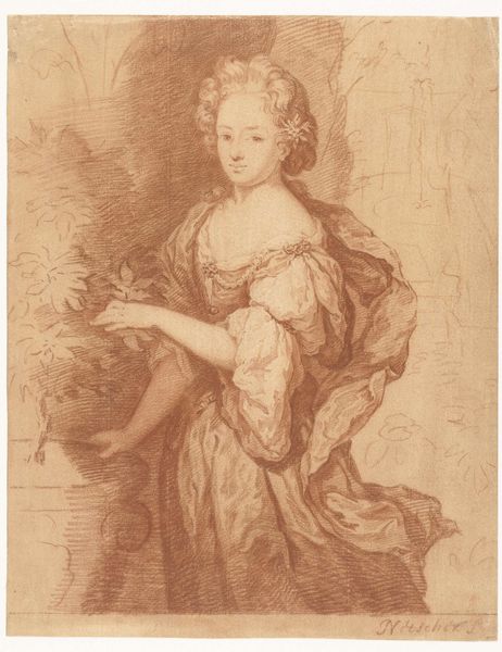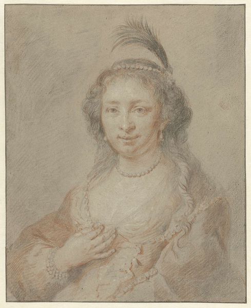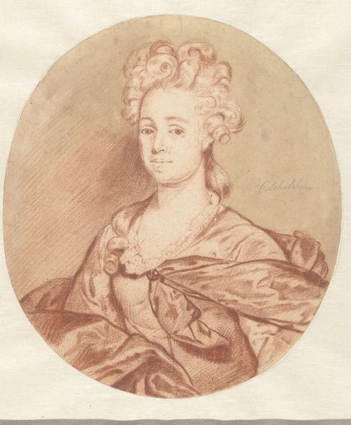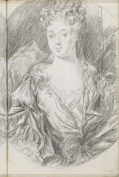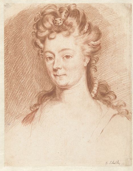 Mattheus Verheyden made this portrait of a young woman, sometime in the 18th century, using chalk on paper. The image provides a glimpse into the social and cultural norms of the Dutch Republic. During this era, portraiture was a privilege largely reserved for the elite, reflecting their status and wealth. The woman's elaborate hairstyle and delicate features signal her position within the upper classes. Consider the institutional history of art during this time. Art academies played an increasingly important role in shaping artistic styles and standards. What does it mean to display such an image in a museum today? It invites us to reflect on the politics of imagery, and how certain groups have historically been represented and celebrated, while others have been marginalized. To understand this artwork better, one might delve into the social history of the Dutch Republic, exploring sources like period diaries, letters, and economic records. Art is contingent on social and institutional context.