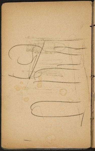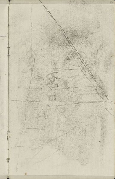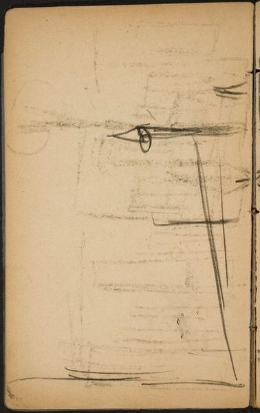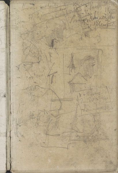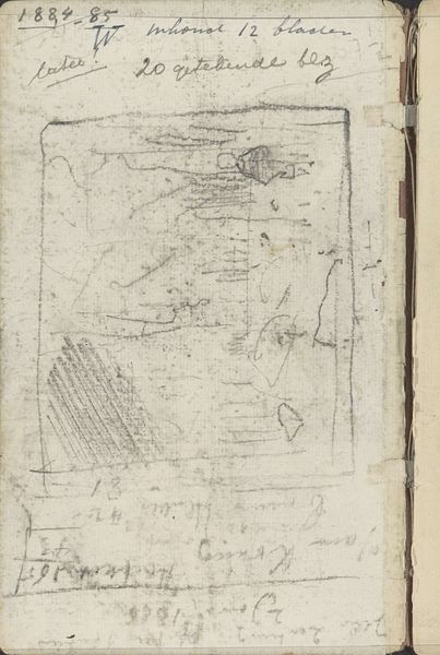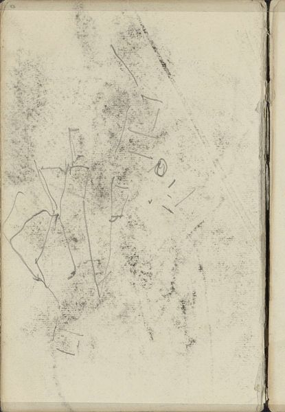 Curator: We are looking at "Studie," a pencil drawing on paper, likely from somewhere between 1883 and 1886, by George Hendrik Breitner. What's your take on it? Editor: Chaotic beauty comes to mind. A flurry of lines hinting at… figures, maybe? There’s a raw energy, almost violent, despite being just a humble pencil sketch. The thin lines create the illusion of the form trying to emerge from the very sheet, but at the same time it is enclosed and limited by the sketchbook and page boundaries. Curator: Breitner was all about capturing fleeting moments. Trained as an academic painter, he quickly moved towards this type of impressionistic work, very spontaneous. Think of it almost like a snapshot—not meant to be perfect, but authentic. A captured thought. Editor: Authentic to the production constraints, sure. Note the visible binding; these are the margins and limitations of his material conditions, right there on the page, and the way that informs the composition. It begs the question: How do sketchbooks and cheap materials shape and limit, enable or affect our art making and aesthetics, not to mention the kind of narratives around high art and craft, labor and the artistic genius? Curator: Precisely! It's not a grand statement, it's a fragment. You can imagine Breitner just quickly pulling out his sketchbook in the street, jotting down what he sees, with an immediacy that more traditional methods wouldn't allow. Editor: You can almost feel the rough texture of the paper, the quick scratching of the pencil. We see his process laid bare. What were the costs for such material and production? Breitner was not known for glorifying things but taking a hard look at working conditions, materials, and realities, so this becomes almost a record of class structures during the era. Curator: It’s almost voyeuristic. You get this incredibly intimate glimpse into his creative process. In his other paintings there are studies of horses, or workers…I see these same figures in this sketch, it reminds me of when he started moving from traditional studies towards everyday life observation as a main motif. Editor: In the everyday materials themselves lie stories waiting to be uncovered. It’s not just about the aesthetic representation, but about all the material and social relations involved in production from start to finish. It challenges us to reconsider the boundaries of art. Curator: For me it underscores how much intention is revealed in its imperfections. It's lovely, in that way. Editor: For me it is in what its imperfections reveal about the history, materiality, and means behind the creation of an artwork like this.
