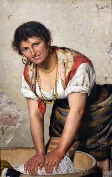 Pasquale Celommi created ‘Laundress’ with oil on canvas, and what strikes me first is the warmth of the palette. It’s all earthy reds, creams, and browns, giving the image a closeness, like an old photograph. There’s a process of layering and building up of form here, especially in the rendering of the hands. The texture of the paint is smooth but deliberate, not quite concealing the brushwork. Look at the detail in the woman’s face, the rosy cheeks, the soft, rounded forms, and how these contrast with the more detailed areas like the scarf or the wooden tub. Her hands, immersed in the soapy water, are the central focus. It’s a testament to everyday labour, but painted with a tender eye. This is reminiscent of Millet, but with more of an Italian light. Celommi wasn’t afraid to embrace sentimentality, and that makes his work very human. There’s a deep sense of connection here, between the artist and the woman, between us and the painting, across time.