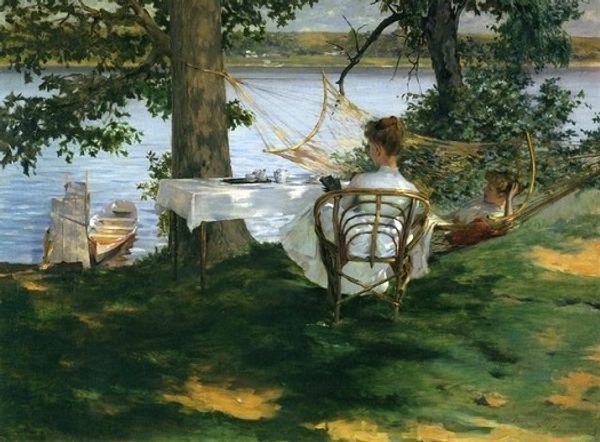 Jean Béraud captured this scene, likely in the late 19th century, with oil on canvas, presenting a tableau of leisure and contemplation. Notice the ship on the horizon, a vessel of travel and trade, juxtaposed with the seated woman. A solitary figure in repose, she holds a glass, her gaze fixed on the distance, embodying a sense of longing or anticipation. This act of looking into the distance has roots in the Renaissance "Donna alla finestra". Consider, too, the table set for one, suggesting isolation, yet it also invokes a moment of personal reflection. The recurring motif of solitude, so central to the Romantics, speaks to the individual's inner life and the introspective gaze. It has resurfaced through history in various guises and embodies both the pleasure and the weight of introspection, engaging us in its timeless psychological dance.