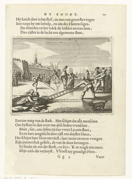 Editor: We're looking at an engraving from between 1625 and 1635, called "Man en vrouw dragen een kist met spullen," currently held at the Rijksmuseum, by an anonymous artist. The scene shows a man and a woman carrying a chest. There’s something weary about it. How do you interpret this work? Curator: As a materialist, I’m drawn to the production of this engraving and how it relates to social conditions of the time. The line work is incredibly detailed for an engraving of this size, implying a significant amount of labor by the printmaker, who might not even be the artist whose design is represented here. Consider what the act of engraving—of mass producing imagery—meant in early modern Europe. What sort of social function would this image have had? Editor: You’re saying to think about how prints were made, like a little industry? Who would have been buying this sort of thing? Curator: Precisely! Think about the audience. It wasn’t the elite commissioning grand history paintings, but perhaps a growing merchant class interested in images reflecting their own daily lives and values. The text gives a clue to its social use, likely intended to adorn domestic spaces and convey moral lessons, but do you think its visual execution and mode of circulation adds to or contradicts that meaning? Editor: Interesting, so this wasn’t just a pretty picture, it was connected to bigger changes in society and the way people were living. The effort that went into creating multiple versions of this piece reflects on what’s valued, both in making and observing this print. Curator: Exactly. It bridges that divide we sometimes impose between "high" art and craft and opens it to social commentary. Thank you, it has highlighted elements I hadn't fully appreciated before. Editor: I hadn't considered art-making from this social point of view, seeing artistic decisions rooted in economic reality. Thank you!