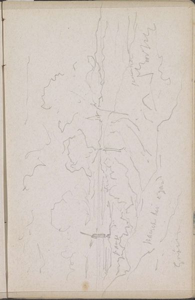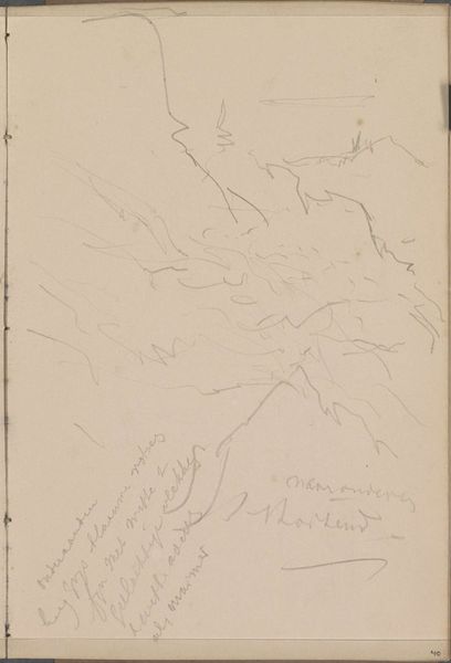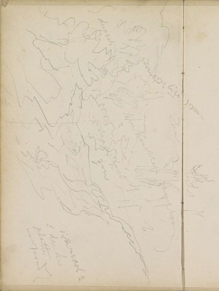 Curator: So much space in this pencil sketch by Johannes Tavenraat. What do you see? Editor: Ghostly mountains looming from mist... Or maybe it's the other way around: the mist is devouring everything! There is a fragile, tentative quality here. It feels unresolved, somehow vulnerable. Curator: "Heuvellandschap", or "Hill Landscape," drawn somewhere between 1839 and 1872. Look closely; those aren't mistakes or smudges. It’s all meticulous pencil work on paper. He uses line in the most evocative way. Editor: Those tentative lines are beautiful. You see them everywhere as a technique by Romanticists. Are they conveying uncertainty or suggesting limitlessness, or something in between? It really captures that Romantic fascination with sublime, indifferent nature. A real tension. Curator: Absolutely. This era saw landscape painting surge in popularity—consider the rise of nationalism and burgeoning interest in national topographies. Did representing these landscapes play a part in shaping ideas about belonging, about ownership? And what about the pencil? That medium isn’t the sort typically on display! Was Tavenraat’s creative practice different, or was this just one element within a larger strategy of recognition? Editor: You always bring things down to institutions, don't you? The play between private studies, public presentation, the art market… I get it. But can we appreciate, for a moment, its ethereal quality? It pulls you in, whispers secrets… This drawing almost has more of an emotional quality than a typical landscape would. Curator: Fair enough. Though it's hard not to consider that feeling of being 'pulled in' without acknowledging Romanticism as a structured movement which had public ambitions and financial goals... What am I really experiencing in this image if my reception is prefigured, influenced by cultural frameworks? Editor: Well, the point isn't to strip away all context, but to let all those factors and feelings churn about, spark new reactions! Perhaps we're feeling some ghost of Tavenraat's inner world projected onto that misty scene? Curator: Well said. Perhaps we are all vulnerable hills in the end, our solid form revealed through ghostly, dissolving lines.