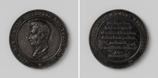 This medal, whose creation is attributed to J. Everts, captures a 'Schuttersfeest', a traditional shooting festival. The medal's circular form, divided into two distinct sides, presents a study in contrasts. One side depicts an archer in a natural setting, the scene framed by an inscription around the edge. The composition here is dynamic, with the archer poised in action, suggesting movement and engagement with the surrounding space. The opposite side offers a stark contrast, presenting a textual inscription encircled by a wreath, evoking a sense of commemoration and order. The medal's monochrome palette underscores its structural elements, emphasizing form and texture over color. This deliberate choice directs our attention to the craftsmanship and the interplay of positive and negative space, highlighting the medal's function not merely as a commemorative object, but as a structured representation of cultural values and historical memory.