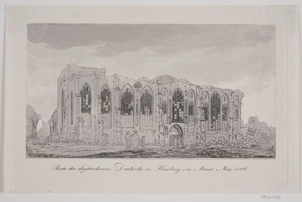 Editor: This is "View of the Sainte-Chapelle in Paris," an etching by Jean-Baptiste Arnout from around 1820. I'm immediately struck by how the architectural details are rendered with such precision, especially given it's a print. How does the medium influence your reading of the piece? Curator: I'm particularly interested in how the etching process, a repeatable medium, democratizes the image of power embedded in the Sainte-Chapelle. The labor of the artist—Arnout's intricate work with the etching needle—reproduces this symbol of religious and royal authority, making it available for broader consumption. We might also consider the social context. What purpose did these prints serve beyond mere decoration? Editor: So, instead of just seeing a beautiful building, we should think about who could afford these prints and what they represented at the time? Curator: Exactly! The materiality of the print, the paper, the ink, becomes part of the narrative. How does mass reproduction change the aura or perceived value of a monument like Sainte-Chapelle? Consider the resources and labor involved in the etching versus, say, commissioning a painting. Editor: That makes me think about the distribution networks and how they shaped access to art in the 19th century. Was Arnout intentionally commenting on that through his work, or was it simply a practical means to an end? Curator: Intentions are hard to know. But we can analyze how Arnout's choice of medium – etching, a method enabling multiples – speaks to broader social shifts towards increased accessibility and the changing relationship between art, power, and the public. This wasn’t a unique commission, it was designed for consumption. Editor: I never considered that a print could reveal so much about social structures! Thanks for making me rethink my perspective on this. Curator: It's precisely that connection between materials, methods, and social meaning that makes art history so compelling. Hopefully, others appreciate this dialogue as well!
