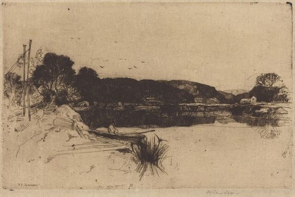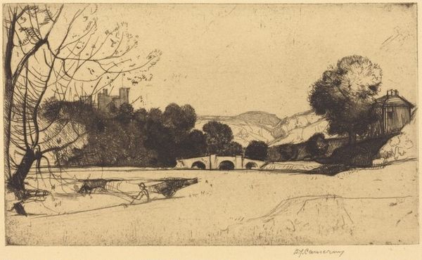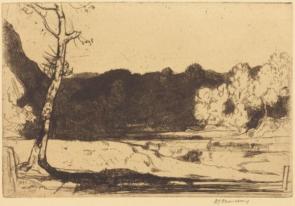 Editor: We're looking at David Young Cameron's etching "The Valley of the Lathkill", from 1902. I'm immediately struck by how moody and atmospheric it is, despite its small scale. The dark, looming shadows create a real sense of depth and mystery. What do you see in this piece? Curator: It whispers stories to me, like a half-forgotten dream of a summer afternoon. Notice how Cameron uses the etching technique to conjure light from darkness? Those shadows aren't just empty spaces; they're filled with subtle textures, hinting at hidden forms, a place where fairies might just dare to come out for tea and crumpets if only one looked close enough. It almost feels a bit romantic to me. What does it evoke for you? Editor: I like the fairy-tale interpretation, it really opens up the piece. I was more drawn to the contrast between the detailed foreground and the hazier background, almost like memory fading into the distance. I am also intrigued by the lines emanating from the sky and think they seem so unusual. Curator: Absolutely! That interplay of sharp detail and dreamy vagueness captures the very essence of landscape as something both present and remembered. The "lines" from the sky might have resulted from an uncleaned plate after its last biting from the acid during etching - who can know for sure the intention! And consider this valley – what is it about a valley that seems to inspire contemplation, a gentle introspection? Is it the feeling of being sheltered, cradled by the land itself? Editor: That's a great point! I hadn't really thought about it that way. I guess, it's kind of like a quiet haven. Curator: Precisely. And that, my friend, is the magic of art: how it encourages us to pause, to ponder, and maybe even to see the world a little differently. Editor: I definitely learned a new perspective about art’s magic with that point. I never looked at shadows with texture. Thanks!