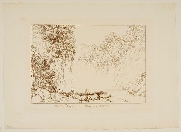 Curator: This is Joseph Mallord William Turner's "From Spenser's 'Fairy Queen'," currently residing at the Harvard Art Museums. Editor: It's delicate, almost dreamlike. The etched lines create such a soft, ethereal landscape. Curator: Turner was deeply engaged with the romantic ideals prevalent in his era, drawing inspiration from literature and nature. The political and social upheavals shaped the public's desire for escapism. Editor: I'm drawn to how the material of the etching—the ink on paper—gives such a tangible presence to something so seemingly intangible. It's a manufactured vista. Curator: Indeed. The artwork presents a manufactured vista, yet in this manufactured vista, he reflects the public’s need for this type of visual imagery. Editor: Thinking about the labor involved—the skilled hand etching these fine lines—it reveals the artist's role in shaping our vision of beauty, and the material conditions enabling that vision. Curator: A fitting conclusion, I'd say, for an artwork attempting to transport its audience to another world. Editor: Yes, a collaboration of labor and fantasy, presented for consumption.